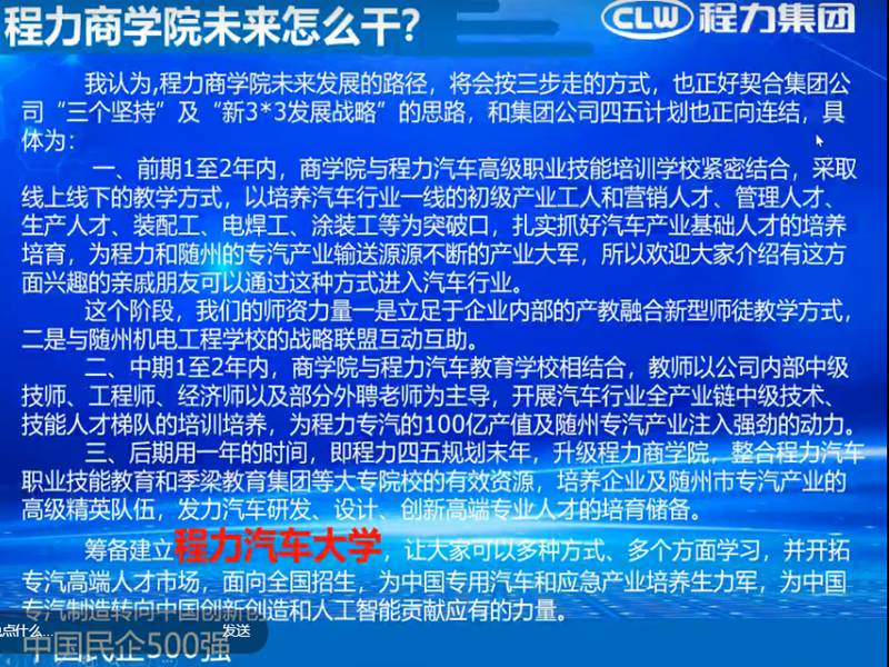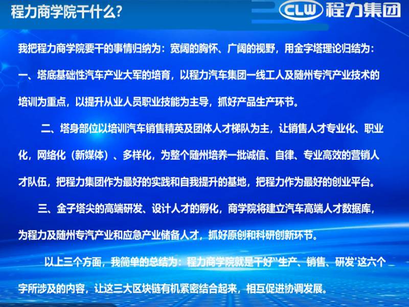 2020年確是一個不同尋常的一年,一場新型冠狀病毒感染的肺炎疫情席卷全國,牽動著億萬國人的心。湖北程力作為中國民營500強企業(yè),公司領(lǐng)導多次為隨州捐款,捐物。為隨州百姓做貢獻。在疫情期間程力商學院組織各專業(yè)廠技術(shù)專家講師為程力汽車銷售經(jīng)理提供釘釘在線網(wǎng)上產(chǎn)品業(yè)務(wù)知識培訓學習。下面是程力汽車集團公司總經(jīng)理董事長程阿羅在程力商學院開播致辭網(wǎng)路連線圖片: ![]() 總經(jīng)理在會上闡述: A:什么是程力商學院? 程力汽車集團股份有限公司的主要四大業(yè)務(wù)矩陣,即:汽車、金融、教育、投資。 這四大產(chǎn)業(yè)矩陣中,汽車是涵蓋專用汽車、商用車、新能源汽車、客車、汽車零部件,微卡、輕卡、中卡、重卡、皮卡底盤及整車的研發(fā)生產(chǎn)與銷售,以及應急專用汽車的產(chǎn)業(yè)全方位產(chǎn)業(yè)建設(shè)、配套與生產(chǎn)營銷。 金融作為企業(yè)發(fā)展的血脈,也主要是圍繞著以汽車產(chǎn)業(yè)進行匹配和支撐;第三個增長極,就是我們的教育矩陣,這也是為程力的汽車產(chǎn)業(yè),乃至為隨州作為中國專汽之都的大工業(yè),做汽車產(chǎn)業(yè)基礎(chǔ)人才培訓和高端研發(fā)設(shè)計、營銷人才的孵化提升;當然,作為資本的逐利的本質(zhì)屬性,公司也會對前瞻性、新興高科技產(chǎn)業(yè)和國家鼓勵的戰(zhàn)略性支柱產(chǎn)業(yè)做適當?shù)耐顿Y。 明白了這些思路,我們就可以很好的理解什么是程力商學院了。 簡單的講,程力商學院就是以汽車研發(fā)生產(chǎn)銷售為主要內(nèi)容,進行學習交流的職業(yè)教育平臺,它分為線上網(wǎng)絡(luò)直播課堂學習及線下實體培訓學習的兩種方式,商學院匯聚了社會各界的專家、教授,智囊、企業(yè)家、行業(yè)泰斗、營銷精英及政商高端人才,是汽車產(chǎn)業(yè)發(fā)展的知識寶庫和動力源泉,商學院從2018年籌建上線,至今已2年 B: 程力商學院干什么? 程力商學院要干的事情歸納為:寬闊的胸懷、廣闊的視野,用金字塔理論歸結(jié)為: 一、塔底基礎(chǔ)性汽車產(chǎn)業(yè)大軍的培育,以程力汽車集團一線工人及隨州專汽產(chǎn)業(yè)技術(shù)的培訓為重點,以提升從業(yè)人員職業(yè)技能為主導,抓好產(chǎn)品生產(chǎn)環(huán)節(jié)。 二、塔身部位以培訓汽車銷售精英及團體人才梯隊為主,讓銷售人才專業(yè)化、職業(yè)化,網(wǎng)絡(luò)化(新媒體)、多樣化,為整個隨州培養(yǎng)一批誠信、自律、專業(yè)高效的營銷人才隊伍,把程力集團作為最好的實踐和自我提升的基地,把程力作為最好的創(chuàng)業(yè)平臺。 三、金子塔尖的高端研發(fā)、設(shè)計人才的孵化,商學院將建立汽車高端人才數(shù)據(jù)庫,為程力及隨州專汽產(chǎn)業(yè)和應急產(chǎn)業(yè)儲備人才,抓好原創(chuàng)和科研創(chuàng)新環(huán)節(jié)。 以上三個方面,我簡單的總結(jié)為:程力商學院就是干好“生產(chǎn)、銷售、研發(fā)'這六個字所涉及的內(nèi)容,讓這三大區(qū)塊鏈有機緊密結(jié)合起來,相互促進協(xié)調(diào)發(fā)展。 C程力商學院未來干什么? ![]() 公司總經(jīng)理程阿羅對商學院的殷切希望 ![]() 程力商學院網(wǎng)上第一期(疫情期間)培訓學習結(jié)束語: “沉舟側(cè)畔千帆過,病樹前頭萬木春”,走過黑暗我們必將迎來光明;走過黑暗我們必將更加美好!疫情帶給我們暫時的困難,只要我們不忘初心任重道遠堅如磐石,我們一定會更加眾志成城逆勢而上再創(chuàng)佳績。 大家一定要知道,疫情過后,國家一定會加大投資,未來五年,將是創(chuàng)業(yè)者最佳的機會,所以現(xiàn)在大家就要加強學習,為隨時迎接經(jīng)濟繁榮、市場擴大做好準備。 程力一定要為有準備者提供最好的創(chuàng)業(yè)平臺,只要你有夢想、無論你是想帶團隊做銷售還是想帶團隊成為專業(yè)廠做專業(yè)產(chǎn)品,程力的三個廠區(qū)都能為你帶來最好的創(chuàng)業(yè)環(huán)境,或者自己有廠房想加入程力,程力一定為你提供最好的服務(wù)團隊,最大的銷售市場,最響亮的品牌,一定幫你實現(xiàn)你的夢想,沒有什么不可實現(xiàn),只怕你不去一點點學習,在程力找到自己的定位然后再突破。 同志們,我相信有了程力商學院和大家共同進步,大家的夢想都一定能實現(xiàn)。 程力汽車集團2020年3月8日 |
