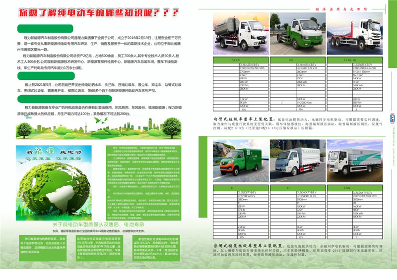 程力新能源純電動(dòng)專用汽車隸屬于程力集團(tuán),簡(jiǎn)稱“程力新能源”,集團(tuán)是一家擁有“國(guó)家高新技術(shù)企業(yè)”“中國(guó)民企500強(qiáng)”“中國(guó)馳名商標(biāo)”的大型汽車制造集團(tuán),是集汽車技術(shù)研發(fā)、汽車制造、客車制造、汽車改裝、汽車零部件、金融、教育、置業(yè)投資為一體的多元化集團(tuán)公司。 關(guān)于程力新能源汽車 程力新能源汽車制造股份有限公司是程力集團(tuán)旗下全資子公司,成立于2016年2月19日,注冊(cè)資金伍千萬元整,是一家專業(yè)從事新能源純電動(dòng)專用汽車研發(fā)、生產(chǎn)、銷售及服務(wù)于一體的高新技術(shù)企業(yè)。公司位于湖北省隨州市曾都區(qū)星光一路。 程力新能源汽車制造股份有限公司,占地500余畝,員工700余人,其中專業(yè)技術(shù)人員50多人,技術(shù)工人300余名,公司現(xiàn)有新能源技術(shù)研發(fā)中心、新能源零部件檢測(cè)中心、新能源汽車總裝車間、整車下線檢測(cè)線。年生產(chǎn)純電動(dòng)專用汽車能力1萬余臺(tái)(輛)。 關(guān)于程力純電動(dòng)車型 截止到2021年5月,公司目前已開發(fā)出純電動(dòng)灑水車、洗掃車、壓縮垃圾車、吸塵車、抑塵車、勾臂式垃圾車、密閉式垃圾車、路面養(yǎng)護(hù)車、餐廚垃圾車、等60多個(gè)自主創(chuàng)新新能源純電動(dòng)汽車系列產(chǎn)品。 主要純電動(dòng)底盤合作商以及生產(chǎn)能力 程力新能源裝備車專業(yè)廠的純電動(dòng)底盤合作商有比亞迪商用、東風(fēng)商用、東風(fēng)股份、福田新能源;程力新能源依托成熟強(qiáng)大的供應(yīng)鏈,月生產(chǎn)能力可達(dá)100臺(tái),緊急情況下可達(dá)到200臺(tái)。 關(guān)于純電動(dòng)汽車三電系統(tǒng) 電池:負(fù)責(zé)給車輛底盤電機(jī)、上裝電機(jī)提供動(dòng)力源,相當(dāng)于燃油車油箱;新能源純電動(dòng)主要由電芯與電池管理系統(tǒng)等組成,電動(dòng)車車載電池一般使用鋰離子電池,國(guó)內(nèi)的電動(dòng)汽車所用鋰離子電池一般采用三元鋰電和磷酸鐵鋰兩種。 讓天更藍(lán)讓水更綠 三元鋰電特點(diǎn):能量密度最高,同等質(zhì)量下電池電容量更高,續(xù)航里程更長(zhǎng),熱穩(wěn)定性差、低溫性能好,但是安全性相比磷酸鐵鋰更差。特斯拉等歐美車主要選擇此類電池。 磷酸鐵鋰特點(diǎn):能量密度中等,同等質(zhì)量下電容量和續(xù)航里程低于三元鋰電,低溫性能差、熱穩(wěn)定性好;安全性相當(dāng)可靠,在所有鋰電池里面安全性最高,且其發(fā)展前景相當(dāng)廣闊。(比亞迪下一代刀片電池就具有更高的能量密度。同等質(zhì)量電容量與續(xù)航里程與三元鋰電不相上下)、比亞迪、寧德時(shí)代等國(guó)內(nèi)頂尖電池企業(yè)均采用磷酸鐵鋰電池;我公司生產(chǎn)車型電池90%為磷酸鐵鋰。 電機(jī):負(fù)責(zé)給車輛底盤驅(qū)動(dòng)、上裝驅(qū)動(dòng)提供動(dòng)力,大概相當(dāng)于燃油車發(fā)動(dòng)機(jī);電機(jī)是電動(dòng)車電驅(qū)系統(tǒng)的主要部分,電驅(qū)主要由傳動(dòng)系統(tǒng)、電機(jī)、逆變器組成,純電動(dòng)車用電機(jī)主要有直流電機(jī)、感應(yīng)電機(jī)、永磁同步電機(jī)三種。國(guó)內(nèi)主流生產(chǎn)企業(yè)基本上都用永磁同步電機(jī),永磁同步電機(jī)具有最低的電能損耗、最高的峰值效率、比功率、可靠性強(qiáng)、尺寸小等優(yōu)點(diǎn)。 電控:電池輸出的電流經(jīng)過電控系統(tǒng),調(diào)控到底盤電機(jī)或上裝電機(jī)適用的電壓,對(duì)電動(dòng)汽車的爬坡、加速、減速、倒車等主要性能進(jìn)行調(diào)控。主要作用大概相當(dāng)于燃油車變速箱:但功能更加復(fù)雜。關(guān)于純電動(dòng)車型質(zhì)保以及售后、電池壽命東風(fēng)、福田等底盤目前在全國(guó)的商用車4S服務(wù)站售后服務(wù),總部提供技術(shù)支持。 BYD底盤單獨(dú)的售后體系、目前比亞迪純電動(dòng)底盤三電系統(tǒng)質(zhì)保電池性能在充放電4000次以內(nèi)衰每個(gè)省會(huì)都有駐點(diǎn),由駐點(diǎn)服務(wù)人員5年25萬公里,東風(fēng)和福田的純電動(dòng)減在15%以內(nèi),壽命超過8年;電池更售后服務(wù),后期根據(jù)當(dāng)?shù)卣加辛縼黹_底盤三電系統(tǒng)質(zhì)保5年20萬公里;底換價(jià)格根據(jù)更換時(shí)的4S店實(shí)際價(jià)格,底盤其他配件質(zhì)保與燃油車相同。車輛具體政策還未統(tǒng)一下來。電池回收目通售后服務(wù)網(wǎng)點(diǎn)。上裝系統(tǒng)和配件質(zhì)保2年(易損件除前大概是200元/kw左右;具體價(jià)格以外)。實(shí)時(shí)實(shí)地價(jià)格為準(zhǔn)。 目前程力新能源汽車制造股份有限公司已取得新能源純電動(dòng)專用車作業(yè)類、廂式類整車生產(chǎn)許可資質(zhì),公司已開發(fā)純電動(dòng)灑水車,抑塵車廂式運(yùn)輸車、純電動(dòng)冷藏車、純電動(dòng)勾臂式垃圾車、純電動(dòng)密閉式垃圾車等10多個(gè)自主創(chuàng)新新能源純電動(dòng)汽車系列產(chǎn)品。 程力新能源純電動(dòng)廂式運(yùn)輸車,程力純電動(dòng)灑水車,程力純電動(dòng)抑塵車 ![]() 程力牌純電動(dòng)壓縮垃圾車系列,程力牌新能源環(huán)衛(wèi)垃圾車餐廚垃圾車,程力新能源勾臂垃圾車 ![]() 