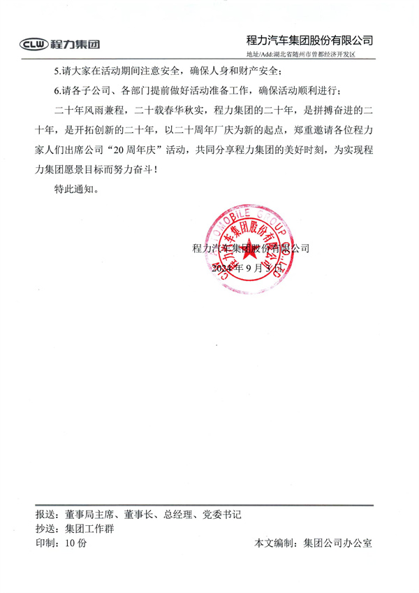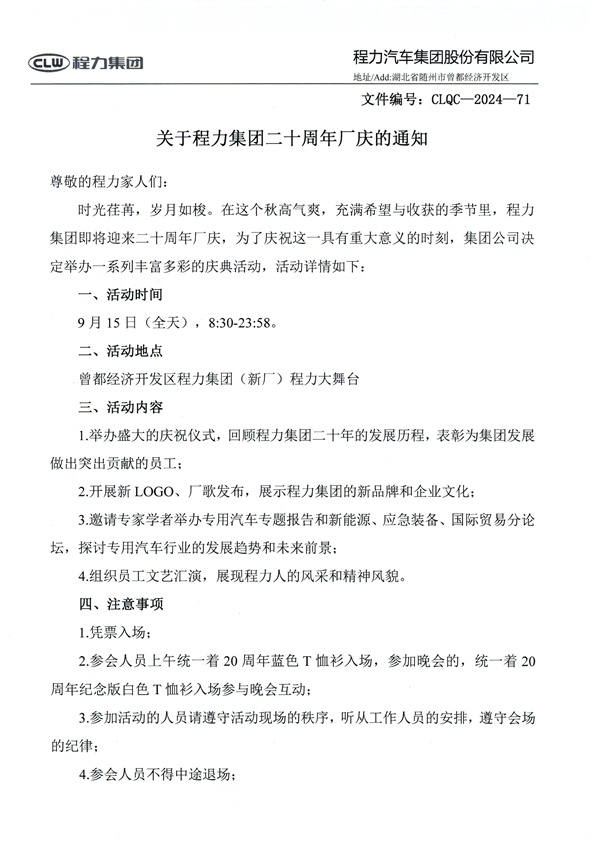 關(guān)于程力集團(tuán)二十周年廠慶的通知 尊敬的程力家人們: 時(shí)光荏苒,歲月如梭。在這個(gè)秋高氣爽,充滿希望與收獲的季節(jié)里,程力集團(tuán)即將迎來二十周年廠慶,為了慶祝這一具有重大意義的時(shí)刻,集團(tuán)公司決定舉辦一系列豐富多彩的慶典活動(dòng),活動(dòng)詳情如下: 一、活動(dòng)時(shí)間 9月15日(全天),8:30-23:58。 二、活動(dòng)地點(diǎn) 曾都經(jīng)濟(jì)開發(fā)區(qū)程力集團(tuán)(新廠)程力大舞臺 ![]() 三、活動(dòng)內(nèi)容 1.舉辦盛大的慶祝儀式,回顧程力集團(tuán)二十年的發(fā)展歷程,表彰為集團(tuán)發(fā)展做出突出貢獻(xiàn)的員工; 2.開展新LOGO、廠歌發(fā)布,展示程力集團(tuán)的新品牌和企業(yè)文化; 3.邀請專家學(xué)者舉辦專用汽車專題報(bào)告和新能源、應(yīng)急裝備、國際貿(mào)易分論壇,探討專用汽車行業(yè)的發(fā)展趨勢和未來前景; 4.組織員工文藝匯演,展現(xiàn)程力人的風(fēng)采和精神風(fēng)貌。 四、注意事項(xiàng) 1.憑票入場; 2.參會(huì)人員上午統(tǒng)一著20周年藍(lán)色T恤衫入場,參加晚會(huì)的,統(tǒng)一著20 周年紀(jì)念版白色T恤衫入場參與晚會(huì)互動(dòng); 3.參加活動(dòng)的人員請遵守活動(dòng)現(xiàn)場的秩序,聽從工作人員的安排,遵守會(huì)場的紀(jì)律; 4.參會(huì)人員不得中途退場; 5.請大家在活動(dòng)期間注意安全,確保人身和財(cái)產(chǎn)安全; 6.請各子公司、各部門提前做好活動(dòng)準(zhǔn)備工作,確;顒(dòng)順利進(jìn)行; 二十年風(fēng)雨兼程,二十載春華秋實(shí),程力集團(tuán)的二十年,是拼搏奮進(jìn)的二十年,是開拓創(chuàng)新的二十年,以二十周年廠慶為新的起點(diǎn),鄭重邀請各位程力家人們出席公司“20周年慶”活動(dòng),共同分享程力集團(tuán)的美好時(shí)刻,為實(shí)現(xiàn)程力集團(tuán)愿景目標(biāo)而努力奮斗! 特此通知。 ![]() ![]() |
