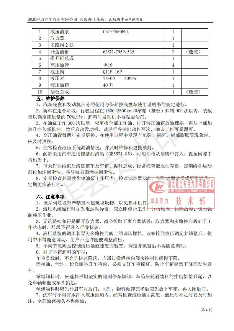 湖北程力專用汽車掛桶式垃圾車(以下簡稱掛桶式垃圾車或者勾臂式垃圾車)是用于城鎮(zhèn)內(nèi)的垃圾收集、轉(zhuǎn)運、卸料作業(yè)的專用車輛。該車是由汽車底盤、自卸油缸、提升機(jī)總成、頂蓋(選裝)、附車架、垃圾箱體等組成。該車操作由液壓控制系統(tǒng)來完成,控制方式可以為手動或電氣控。該車主要用于城鎮(zhèn)垃圾的垃圾收集、轉(zhuǎn)運和卸料。操作開提升控制閥將垃圾桶隨提升機(jī)向上升起并翻轉(zhuǎn)傾斜,桶內(nèi)垃圾被倒入車廂內(nèi)完成垃圾單次裝載,反向操作提升控制閥,垃圾桶隨提升機(jī)而放下;完成垃圾裝載后再進(jìn)行傾卸時,操作自卸控制閥,垃圾箱繞后翻轉(zhuǎn)軸傾斜體舉,箱體后門打開,垃圾傾卸出箱體;起該車由液壓控制系統(tǒng)來完成該車的提升機(jī)的上升和下降及垃圾的自卸功能,降低了工人的勞動強(qiáng)度和改善了工作環(huán)境。該垃圾車的收運方式是目前國內(nèi)泛采用的垃圾收集轉(zhuǎn)運方式,其專用裝置的功能均以汽車發(fā)動機(jī)為動力,通過液壓機(jī)構(gòu)手動或電控、氣控來實現(xiàn)。車輛的箱體采用優(yōu)質(zhì)炭鋼板全密封焊接結(jié)構(gòu),具有強(qiáng)度高、重量輕,防塵、防溢不產(chǎn)生二次污染等優(yōu)點。垃圾車整車基本性能與原底盤車相同,用戶請參閱原底盤車使用手冊。本用說明書僅介紹專用改裝部分的有關(guān)操作、檢查和維修保養(yǎng)。在使用車輛前,我們強(qiáng)烈要求您能夠通讀本說明書,并對其中的操作程序做到得心應(yīng)手。我廠對產(chǎn)品將會進(jìn)一步改進(jìn)。產(chǎn)品的改進(jìn)、性能的提高、結(jié)構(gòu)的不斷完善恕不另行通知,從而有某些說明不適用于您的特定車輛,敬請諒解。下面是湖北程力自裝卸式垃圾車(掛桶式垃圾車)使用說明書:![]() ![]() ![]() ![]() ![]() ![]() |