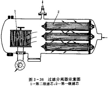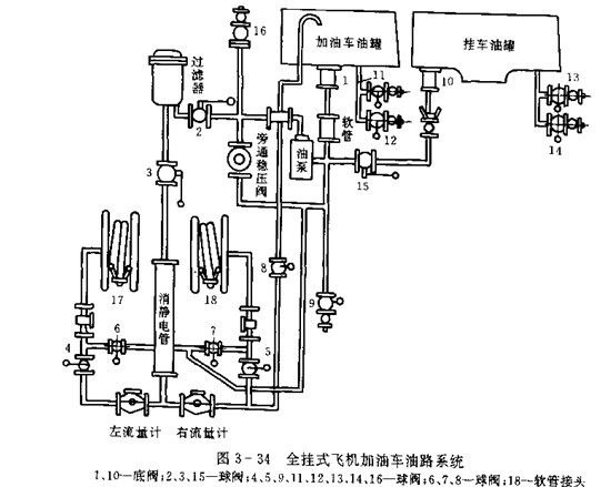 飛機(jī)加油車 (1)飛機(jī)加油的特殊要求,飛機(jī)加油車在總體上與普通加油車基本相同,但結(jié)構(gòu)上還有特殊要求。 ①加油壓力穩(wěn)定性要求高,為此在加油管路上加裝壓力調(diào)節(jié)器,穩(wěn)壓器和壓力加油接冰在。 ②油料的潔凈度高。油路上要用高性能的過(guò)濾分離器。罐體和管道必須采用鋁合金制造。 ③絕對(duì)保證加油安全性。應(yīng)安裝消靜電裝置,聯(lián)鎖控制系統(tǒng)、電氣防爆器、滅火器等。 ④裝有高精度,大流量的計(jì)量器。 ⑤油罐總?cè)萘看,給飛機(jī)加油要一次完成。 (2)飛機(jī)加油車特殊要求的主要部件 ①旁通穩(wěn)壓閥。給飛機(jī)加油,一般采取底部閉式加油,要求加油車具有穩(wěn)定的管端壓力,通常為0.343MPa,而對(duì)車輛加油則不要求管端壓力。一般在油泵上并聯(lián)旁穩(wěn)壓閥,在絞盤后的出油管路上串聯(lián)壓力補(bǔ)償器。圖3-34為全掛式飛機(jī)加油車油路系統(tǒng)圖,油泵上并聯(lián)有旁通穩(wěn)壓閥,其調(diào)定壓力為油泵的工作壓力,由管端壓力和管路的壓力損失確定。圖3-35 為旁通穩(wěn)壓閥的工作原理圖。氣室1內(nèi)充有一定壓力的空氣,上部油室2與泵的出口高壓油相通,氣室活塞3、油室活塞4與閥門5連成一體。在泵正常工用壓力下,氣室的氣體對(duì)活塞3的推力F1與油室油液對(duì)活塞4的推力F2相等,閥門5關(guān)閉不動(dòng),當(dāng)泵出口壓力升高時(shí),油室的壓力隨之升高,F(xiàn)2> F1,活塞在力F=F2-F1的作用下推動(dòng)閥5下移,閥門被打開(kāi),泵的出口與入口油路接通,系統(tǒng)壓力被打開(kāi),泵的出口與入口油路接通,系統(tǒng)壓力開(kāi)始下降,直至恢復(fù)原工作壓力,閥門又呈關(guān)閉狀態(tài)。 ②過(guò)濾分離器,為了獲得高潔凈度燃油,在管路中需加裝高性能的過(guò)濾分離器,將油中的水分,膠質(zhì)和雜質(zhì)分離出來(lái),圖3-36為兩級(jí)過(guò)濾分離器。第一級(jí)濾芯2為聚結(jié)濾芯,由經(jīng)過(guò)特殊處理的濾紙或玻璃纖維,合成材料,毛氈、棉織品等制成。油流經(jīng)濾芯時(shí),首先濾出的固體物質(zhì),再將膠質(zhì)分離,同時(shí)將分離出的小水粒聚集成大水滴,落入由外殼形成的集水器中,第二級(jí)濾芯1為分離器濾芯,表面涂有聚四氟乙烯的表面滑下,滴入集水池中,達(dá)到徹底分離水的作用。