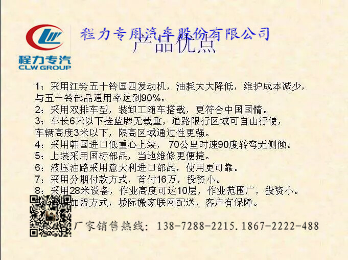 程力公司程力威牌云梯搬家車作業(yè)高度可達(dá)28米,相當(dāng)于10層樓高,云梯車的承載貨物重量每次可達(dá)300公斤,藍(lán)色牌照,C證駕駛室,無需特種操作證。非營(yíng)運(yùn)車輛,使用期限30年。云梯從韓國(guó)進(jìn)口,底盤有東風(fēng)雙排座和江鈴雙排座兩種供用戶選購(gòu)。廠家銷售熱線:0722-3220988.0722-7029866 |