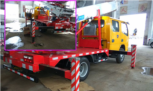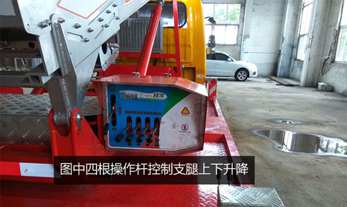 后車板安裝四條H型支腿,通過操作桿液壓控制,可同時(shí)自動(dòng)伸縮。液壓支腿先水平向外伸展然后再垂向下展開,兩邊完全伸展開大約五米左右。液壓支腿控制整個(gè)車的平衡,碳鋼材質(zhì)制成結(jié)實(shí)耐用。