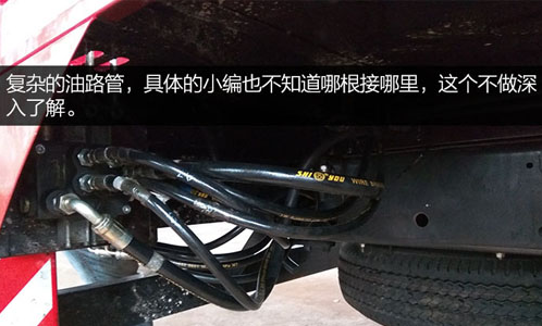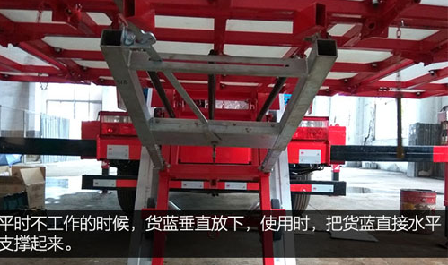 平時(shí)不工作的時(shí)候,貨藍(lán)垂直放下,使用時(shí),把貨藍(lán)直接水平支撐起來。里面的黑色管路專門用于支撐貨藍(lán)的小液壓油缸。