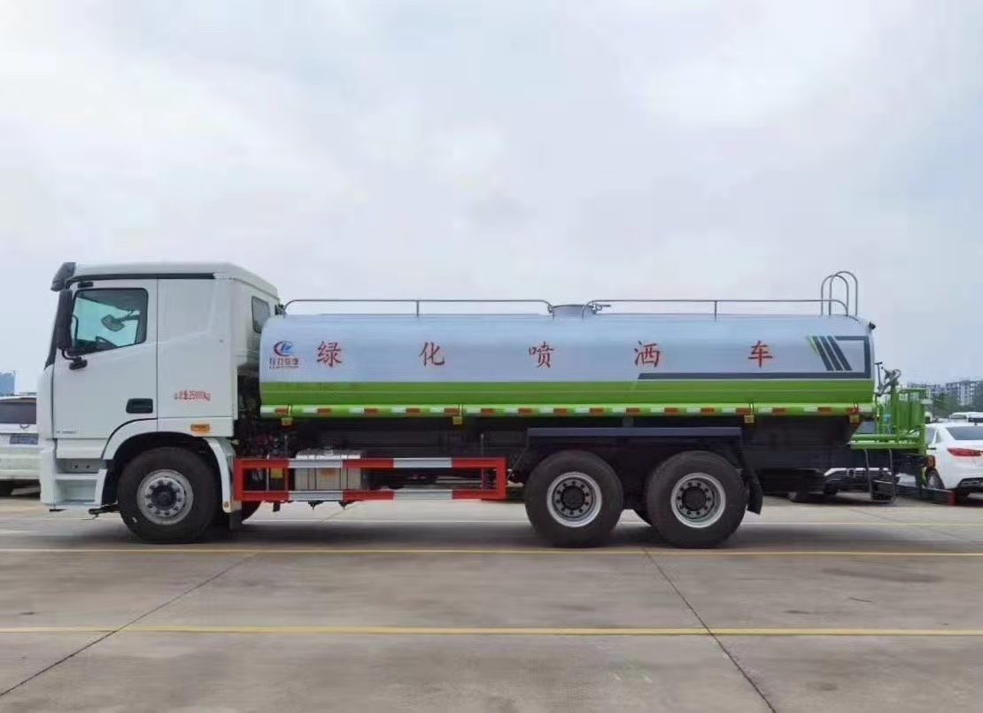 湖北程力國六歐曼后雙橋18-20方綠化噴灑車(灑水車)程力威牌CLW5250GPSBDP型綠化噴灑車廠家配置: 湖北程力國六福田歐曼GTL后雙橋20噸灑水車底盤配置:采用福田歐曼后雙橋原裝底盤,福田歐曼GTL豪華駕駛室,4400+1350mm軸距,搭載國六(國Ⅵ)東風康明斯260馬力柴油發(fā)動機,功率191kw,國六排放,陜齒法士特八檔變速箱,11.00R20鋼絲胎,前橋5T,后橋雙10T,方向助力,斷氣剎,排氣制動,原裝空調(diào),行駛記錄儀,多媒體顯示屏,電動門窗,中控鎖,氣囊座椅,ABS。 湖北程力國六福田歐曼GTL后雙橋20方灑水車專用配置:罐體容積:18立方米,罐體鋼板為5mm碳鋼Q235材質(zhì)專用容積板一次成型,罐內(nèi)隔板具有防波作用,以減輕汽車行駛時罐體液體沖擊;配大功率專用灑水泵,泵可自吸自排;整車前沖、后灑、側噴、后平臺帶綠化灑水炮,灑水炮可全方位旋轉(zhuǎn),可連續(xù)調(diào)成直沖狀、大雨、小雨、毛毛雨;前封頭帶水位計,后平臺主管路帶1寸澆花接口,后爬梯,帶1個消防接頭,帶1個自流閥,1個過濾裝置。
